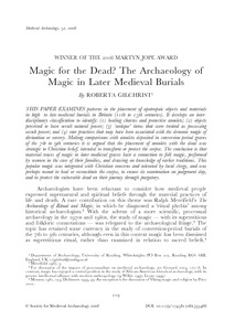 This paper examines patterns in the placement of apotropaic objects and materials in high- to late-medieval burials in Britain (11th to 15th centuries). It develops an interdisciplinary classification to identify: (1) healing charms and protective amulets; (2) objects perceived to have occult natural power; (3) 'antique' items that were treated as possessing occult power; and (4) rare practices that may have been associated with the demonic magic of divination or sorcery. Making comparisons with amulets deposited in conversion-period graves of the 7th to 9th centuries it is argued that the placement of amulets with the dead was strategic to Christian belief, intended to transform or protect the corpse. The conclusion is that material traces of magic in later medieval graves have a connection to folk magic, performed by women in the care of their families, and drawing on knowledge of earlier traditions. This popular magic was integrated with Christian concerns and tolerated by local clergy, and was perhaps meant to heal or reconstitute the corpse, to ensure its reanimation on judgement day, and to protect the vulnerable dead on their journey through purgatory.