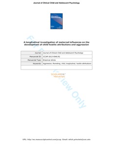 Healy, S. J., Murray, L., Cooper, P. J., Hughes, C. and Halligan, S. L. (2013) A longitudinal investigation of maternal influences on the development of child hostile attributions and aggression. Journal of Clinical Child & Adolescent Psychology, 44 (1). pp. 80-92. ISSN 1537-4424 doi: 10.1080/15374416.2013.850698