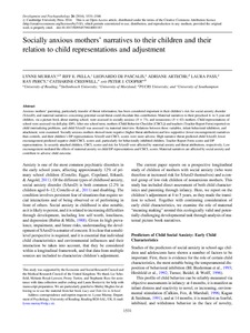 Murray, L., Pella, J., De Pascalis, L., Arteche, A., Pass, L., Percy, R., Creswell, C. and Cooper, P. (2014) Socially anxious mothers’ narratives to their children, and their relation to child representations and adjustment. Development and Psychopathology, 26 (4(2)). pp. 1531-1546. ISSN 1469-2198 doi: 10.1017/S0954579414001187