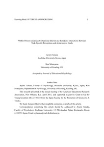 Tanaka, A. and Murayama, K. (2014) Within-person analyses of situational interest and boredom: Interactions between task-specific perceptions and achievement goals. Journal of Educational Psychology, 106 (4). pp. 1122-1134. ISSN 0022-0663 doi: 10.1037/a0036659