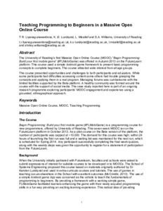 Liyanagunawardena, T. R., Lundqvist, K. O., Micallef, L. and Williams, S. A. (2014) Teaching programming to beginners in a massive open online course. In: OER14: building communities of open practice, 28-29 April 2014, Newcastle.
