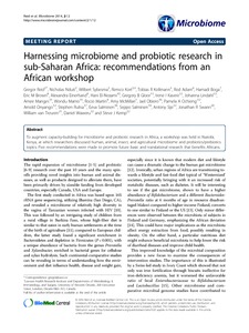 Swann, J. R., Reid, G., Nduti, N., Sybesma, W., Kort, R., Kollmann, T. R., Adam, R., Boga, H., Brown, E. M., Einerhand, A., El-Nezami, H., Gloor, G. B., Kavere, I. I., Lindahl, J., Manges, A., Mamo, W., Martin, R., McMillan, A., Obiero, J., Ochieng, P. A., Onyango, A., Rulisa, S., Salminen, E., Salminen, S., Sije, A., van Treuren, W., Waweru, D. and Kemp, S. J. (2014) Harnessing microbiome and probiotic research in sub-Saharan Africa: recommendations from an African workshop. Microbiome, 2 (12). pp. 1-13. ISSN 2049-2618 doi: 10.1186/2049-2618-2-12