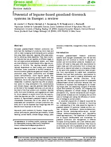 European grassland-based livestock production systems face the challenge of producing more meat and milk to meet increasing world demands and to achieve this using fewer resources. Legumes offer great potential for achieving these objectives. They have numerous features that can act together at different stages in the soil–plant–animal–atmosphere system, and these are most effective in mixed swards with a legume proportion of 30–50%. The resulting benefits include reduced dependence on fossil energy and industrial N-fertilizer, lower quantities of harmful emissions to the environment (greenhouse gases and nitrate), lower production costs, higher productivity and increased protein self-sufficiency. Some legume species offer opportunities for improving animal health with less medication, due to the presence of bioactive secondary metabolites. In addition, legumes may offer an adaptation option to rising atmospheric CO2 concentrations and climate change. Legumes generate these benefits at the level of the managed land-area unit and also at the level of the final product unit. However, legumes suffer from some limitations, and suggestions are made for future research to exploit more fully the opportunities that legumes can offer. In conclusion, the development of legume-based grassland–livestock systems undoubtedly constitutes one of the pillars for more sustainable and competitive ruminant production systems, and it can be expected that forage legumes will become more important in the future.