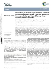 Polymers with the ability to heal themselves could provide access to materials with extended lifetimes in a wide range of applications such as surface coatings, automotive components and aerospace composites. Here we describe the synthesis and characterisation of two novel, stimuli-responsive, supramolecular polymer blends based on π-electron-rich pyrenyl residues and π-electron-deficient, chain-folding aromatic diimides that interact through complementary π–π stacking interactions. Different degrees of supramolecular “cross-linking” were achieved by use of divalent or trivalent poly(ethylene glycol)-based polymers featuring pyrenyl end-groups, blended with a known diimide–ether copolymer. The mechanical properties of the resulting polymer blends revealed that higher degrees of supramolecular “cross-link density” yield materials with enhanced mechanical properties, such as increased tensile modulus, modulus of toughness, elasticity and yield point. After a number of break/heal cycles, these materials were found to retain the characteristics of the pristine polymer blend, and this new approach thus offers a simple route to mechanically robust yet healable materials.