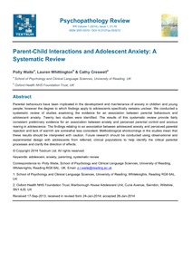 Waite, P. ORCID: https://orcid.org/0000-0002-1967-8028, Whittington, L. and Creswell, C. (2014) Parent-child interactions and adolescent anxiety: a systematic review. Psychopathology Review, 1 (1). pp. 51-76. ISSN 2051-8315 doi: 10.5127/pr.033213