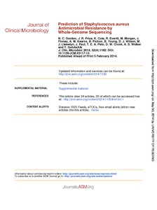 Gordon, N. C., Price, J. R., Cole, K., Everitt, R. G., Morgan, M., Finney, J., Kearns, A. M., Pichon, B., Young, B., Wilson, D. J., Llewelyn, M. J., Paul, J., Peto, T. E. A., Crook, D. W., Walker, A. S. and Golubchik, T. (2014) Prediction of Staphylococcus aureus antimicrobial resistance by whole-genome sequencing. Journal of Clinical Microbiology, 52 (4). pp. 1182-1191. ISSN 0095-1137 doi: 10.1128/JCM.03117-13