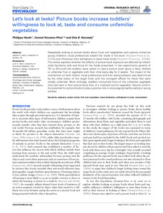 Heath, P., Houston-Price, C. ORCID: https://orcid.org/0000-0001-6368-142X and Kennedy, O. B. ORCID: https://orcid.org/0000-0003-3885-4872 (2014) Let’s look at leeks! Picture books increase toddlers’ willingness to look at, taste and consume unfamiliar vegetables. Frontiers in Psychology, 5 (191). pp. 1-11. ISSN 1664-1078 doi: 10.3389/fpsyg.2014.00191
