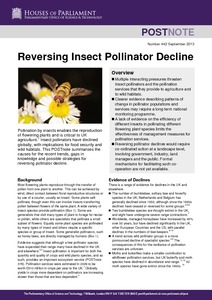Pollination by insects enables the reproduction of flowering plants and is critical to UK agriculture.1 Insect pollinators have declined globally, with implications for food security and wild habitats. This POSTnote summarises the causes for the recent trends, gaps in knowledge and possible strategies for reversing pollinator decline.