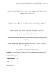 Charman, T., Ricketts, J., Dockrell, J. E., Lindsay, G. and Palikara, O. (2015) Emotional and behavioural problems in children with language impairments and children with autism spectrum disorders. International Journal of Language & Communication Disorders, 50 (1). pp. 84-93. ISSN 1368-2822 doi: 10.1111/1460-6984.12116