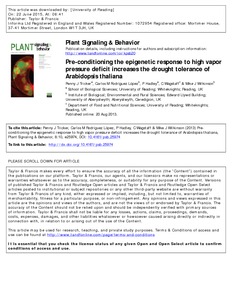 Tricker, P., Rodríguez López, C., Hadley, P., Wagstaff, C. and Wilkinson, M. (2013) Pre-conditioning the epigenetic response to high vapor pressure deficit increases the drought tolerance of Arabidopsis thaliana. Plant Signaling & Behavior, 8 (10). e25974. ISSN 1559-2316 doi: 10.4161/psb.25974