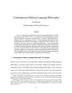 There is a widespread assumption that ordinary language philosophy was killed off sometime in the 1960s or 70s by a combination of Gricean pragmatics and the rapid development of systematic semantic theory. Contrary to that widespread assumption, however, contemporary versions of ordinary language philosophy are alive and flourishing, but going by various aliases—in particular (some versions of) "contextualism" and (some versions of) "experimental philosophy". And a growing group of contemporary philosophers are explicitly embracing the methods as well as the title of ordinary language philosophy and arguing that it has been unfairly maligned and was never decisively refuted. In this overview, I will outline the main projects and arguments employed by contemporary ordinary language philosophers, and make the case that updated versions of the arguments made by ordinary language philosophers in the middle of the twentieth century are attracting renewed attention.