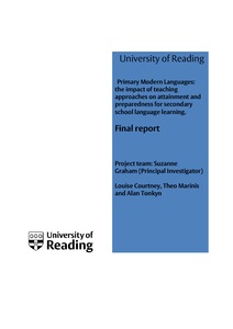 Graham, S. ORCID: https://orcid.org/0000-0002-7743-3977, Courtney, L., Marinis, T. and Tonkyn, A., (2014) Primary Modern Languages: the impact of teaching approaches on attainment and preparedness for secondary school language learning. Project Report. University of Reading (Unpublished)