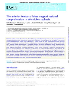 Robson, H., Zahn, R., Keidel, J. L., Binney, R. J., Sage, K. and Lambon Ralph, M. A. (2014) The anterior temporal lobes support residual comprehension in Wernicke’s aphasia. Brain : a journal of neurology, 137 (3). pp. 931-943. ISSN 1460-2156 doi: 10.1093/brain/awt373