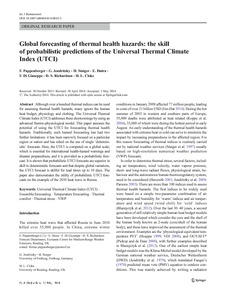 Pappenberger, F., Jendritzky, G., Staiger, H., Dutra, E., Di Giuseppe, F., Richardson, D. S. and Cloke, H. L. ORCID: https://orcid.org/0000-0002-1472-868X (2014) Global forecasting of thermal health hazards: the skill of probabilistic predictions of the Universal Thermal Climate Index (UTCI). International Journal of Biometeorology, 59 (3). pp. 311-323. ISSN 1432-1254 doi: 10.1007/s00484-014-0843-3