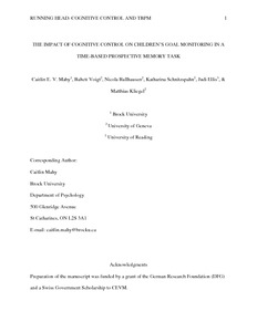 Mahy, C., Voigt, B., Ballhausen, N., Schnitzspahn, K., Ellis, J. and Kliegel, M. (2015) The impact of cognitive control on children's goal monitoring in a time-based prospective memory task. Child Neuropsychology, 21 (6). pp. 823-839. ISSN 1744-4136 doi: 10.1080/09297049.2014.967202