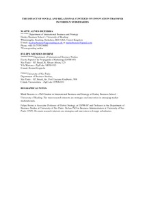 It is widely acknowledged that innovation is one of the pillars of multinational enterprises (MNEs) and that technological knowledge from different host locations is a key factor to the MNEs’ competitive advantages development. Concerning these assumptions, in this paper we aim to understand how the social and the relational contexts affect the conventional and reverse transfer of innovation from MNEs’ subsidiaries hosted in emerging markets. We analyzed the social context through the institutional profile (CIP) level and the relational context through trust and integration levels utilizing a survey sent to 172 foreign subsidiaries located in Brazil, as well as secondary data. Through an ordinary least squares regression (OLS) analysis we found that the relational context affects the conventional and reverse innovation transfer in subsidiaries hosted in emerging markets. We however did not find support for the social context effect.