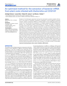 Holmes, A., Birse, L., Jackson, R. W. and Holden, N. J. (2014) An optimized method for the extraction of bacterial mRNA from plant roots infected with Escherichia coli O157:H7. Frontiers in Microbiology, 5. Article 286. ISSN 1664-302X doi: 10.3389/fmicb.2014.00286