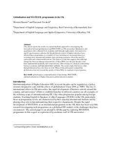 This article reports the results of a mixed-methods approach to investigating the association between globalisation and MATESOL in UK universities. Qualitative and quantitative data collected from academic staff through eight emails, four interviews and 41 questionnaires indicate that the globalised context of higher education have affected these programmes in a number of ways including an increasing interest in recruiting more international students and a growing awareness about the need for curriculum and content modifications. The analysis of the data suggests that although change has been an inherent characteristic of these MAs over the past decade, it has been implemented gradually and conservatively, often relying on a dialectic relationship between academic staff and universities’ policies. The results imply that factors other than globalisation have also been at work. Many of the participants contend that globalisation has not lowered the quality of these MAs or standards of good practice.