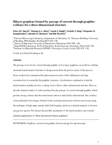 The passage of an electric current through graphite or few-layer graphene can result in a striking structural transformation, but there is disagreement about the precise nature of this process. Some workers have interpreted the phenomenon in terms of the sublimation and edge reconstruction of essentially flat graphitic structures. An alternative explanation is that the transformation actually involves a change from a flat to a three-dimensional structure. Here we describe detailed studies of carbon produced by the passage of a current through graphite which provide strong evidence that the transformed carbon is indeed three-dimensional. The evidence comes primarily from images obtained in the scanning transmission electron microscope using the technique of high-angle annular dark-field imaging, and from a detailed analysis of electron energy loss spectra. We discuss the possible mechanism of the transformation, and consider potential applications of “three-dimensional bilayer graphene”.