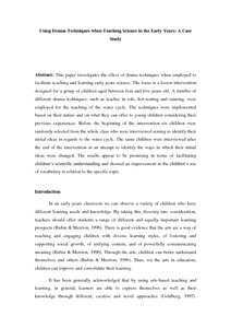 This paper investigates the effect of drama techniques when employed to facilitate teaching and learning early years science. The focus is a lesson intervention designed for a group of children aged between four and five years old. A number of different drama techniques, such as teacher in role, hot seating and miming, were employed for the teaching of the water cycle. The techniques were implemented based on their nature and on what they can offer to young children considering their previous experiences. Before the beginning of the intervention, six children were randomly selected from the whole class, who were interviewed, aiming to identify their initial ideas in regards to the water cycle. The same children were interviewed after the end of the intervention in an attempt to identify the ways in which their initial ideas were changed. The results appear to be promising in terms of facilitating children’s scientific understanding and show an improvement in the children’s use of vocabulary in relation to the specific topic.