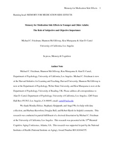 Friedman, M. C., McGillivray, S., Murayama, K. and Castel, A. D. (2015) Memory for medication side effects in younger and older adults: the role of subjective and objective importance. Memory & Cognition, 43 (2). pp. 206-215. ISSN 1532-5946 doi: 10.3758/s13421-014-0476-0
