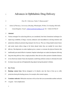 Various strategies for ocular drug delivery are considered; from basic formulation techniques for improving availability of drugs; viscosity enhancers and mucoadhesives aid drug retention and penetration enhancers promote drug transport into the eye. The use of drug loaded contact lenses and ocular inserts allows drugs to be better placed where they are needed for more direct delivery. Developments in ocular implants gives a means to overcome the physical barriers that traditionally prevented effective treatment. Implant technologies are under development allowing long term drug delivery from a single procedure, these devices allow posterior chamber diseases to be effectively treated. Future developments could bring artificial corneas to eliminate the need for donor tissue and one-off implantable drug depots lasting the patient’s lifetime.