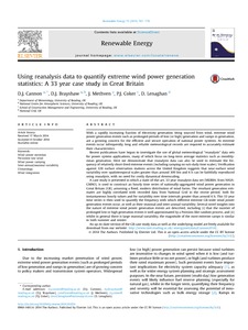 With a rapidly increasing fraction of electricity generation being sourced from wind, extreme wind power generation events such as prolonged periods of low (or high) generation and ramps in generation, are a growing concern for the efficient and secure operation of national power systems. As extreme events occur infrequently, long and reliable meteorological records are required to accurately estimate their characteristics. Recent publications have begun to investigate the use of global meteorological “reanalysis” data sets for power system applications, many of which focus on long-term average statistics such as monthly-mean generation. Here we demonstrate that reanalysis data can also be used to estimate the frequency of relatively short-lived extreme events (including ramping on sub-daily time scales). Verification against 328 surface observation stations across the United Kingdom suggests that near-surface wind variability over spatiotemporal scales greater than around 300 km and 6 h can be faithfully reproduced using reanalysis, with no need for costly dynamical downscaling. A case study is presented in which a state-of-the-art, 33 year reanalysis data set (MERRA, from NASA-GMAO), is used to construct an hourly time series of nationally-aggregated wind power generation in Great Britain (GB), assuming a fixed, modern distribution of wind farms. The resultant generation estimates are highly correlated with recorded data from National Grid in the recent period, both for instantaneous hourly values and for variability over time intervals greater than around 6 h. This 33 year time series is then used to quantify the frequency with which different extreme GB-wide wind power generation events occur, as well as their seasonal and inter-annual variability. Several novel insights into the nature of extreme wind power generation events are described, including (i) that the number of prolonged low or high generation events is well approximated by a Poission-like random process, and (ii) whilst in general there is large seasonal variability, the magnitude of the most extreme ramps is similar in both summer and winter. An up-to-date version of the GB case study data as well as the underlying model are freely available for download from our website: http://www.met.reading.ac.uk/~energymet/data/Cannon2014/.