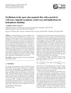 Rouillard, A. and Lockwood, M. ORCID: https://orcid.org/0000-0002-7397-2172 (2004) Oscillations in the open solar magnetic flux with a period of 1.68 years: imprint on galactic cosmic rays and implications for heliospheric shielding. Annales Geophysicae, 22 (12). pp. 4381-4395. ISSN 0992-7689 doi: 10.5194/angeo-22-4381-2004