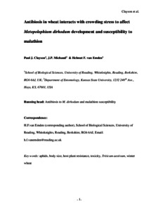 Clason, P. J., Michaud, J. P. and Van Emden, H. F. (2014) Antibiosis in wheat interacts with crowding stress to affect Metopolophiumdirhodum development and susceptibility to malathion. Entomologia Experimentalis Et Applicata, 153 (2). pp. 106-113. ISSN 0013-8703 doi: 10.1111/eea.12235