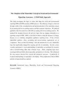 This study investigates the logics or values that shape the social and environmental reporting (SER) and SER assurance (SERA) process. The influence of logics is observed through a study of the conceptualisation and operationalisation of the materiality concept by accounting and non-accounting assurors and their assurance statements. We gathered qualitative data from interviews with both accounting and non-accounting assurors. We analysed the interplay between old and new logics that are shaping materiality as a reporting concept in SER. SER is a rich field in which to study the dynamics of change because it is a voluntary, unregulated, qualitative reporting arena. It has a broad, stakeholder audience, where accounting and non-accounting organisations are in competition. There are three key findings. First, the introduction of a new, stakeholder logic has significantly changed the meaning and role of materiality. Second, a more versatile, performative, social understanding of materiality was portrayed by assurors, with a forward-looking rather than a historic focus. Third, competing logics have encouraged different beliefs about materiality, and practices, to develop. This influenced the way assurors theorised the concept and interpreted outcomes. A patchwork of localised understandings of materiality is developing. Policy implications both in SERA and also in financial audit are explored.