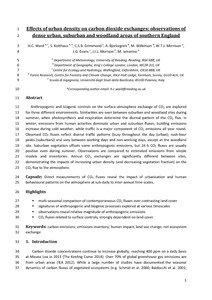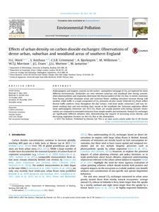 Anthropogenic and biogenic controls on the surface–atmosphere exchange of CO2 are explored for three different environments. Similarities are seen between suburban and woodland sites during summer, when photosynthesis and respiration determine the diurnal pattern of the CO2 flux. In winter, emissions from human activities dominate urban and suburban fluxes; building emissions increase during cold weather, while traffic is a major component of CO2 emissions all year round. Observed CO2 fluxes reflect diurnal traffic patterns (busy throughout the day (urban); rush-hour peaks (suburban)) and vary between working days and non-working days, except at the woodland site. Suburban vegetation offsets some anthropogenic emissions, but 24-h CO2 fluxes are usually positive even during summer. Observations are compared to estimated emissions from simple models and inventories. Annual CO2 exchanges are significantly different between sites, demonstrating the impacts of increasing urban density (and decreasing vegetation fraction) on the CO2 flux to the atmosphere.