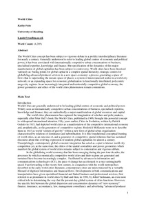 Publisher Statement This is the submitted version of the following book chapter: Pain, K. (2015) World cities. In: International Encyclopedia of Geography: People, the Earth, Environment, and Technology. Wiley, Association of American Geographers, Washington, USA. (In Press), which will be published in final form at DOI 10.1002/9781118786352