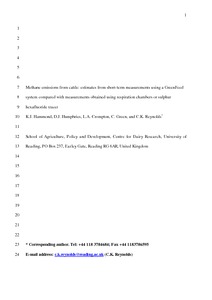 Methane emissions from cattle: estimates from short-term measurements using a Green Feed system compared with measurements obtained using respiration chambers or sulphur hexafluoride tracer.