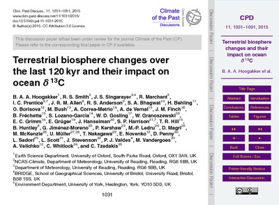 Hoogakker, B. A. A., Smith, R. S. ORCID: https://orcid.org/0000-0001-7479-7778, Singarayer, J. S., Marchant, R., Prentice, I. C., Allen, J., Anderson, R. S., Bhagwat, S. A., Behling, H., Borisova, O., Bush, M., Correa-Metrio, A., de Vernal, A., Finch, J. M., Frechette, B., Lozano-Garcia, S., Gosling, W. D., Granoszewski, W., Grimm, E. C., Gruger, E., Hanselman, J., Harrison, S. P. ORCID: https://orcid.org/0000-0001-5687-1903, Hill, T. R., Huntley, B., Jimenez-Moreno, G., Kershaw, P., Ledru, M.-P., Magri, D., McKenzie, M., Muller-Nakagawa, U., Nakagawa, T., Novenko, E., Penny, D., Sadori, L., Scott, L., Stevenson, J., Valdes, P. J., Vandergoes, M., Velichko, A., Whitlock, C. and Tzedakis, C. (2015) Terrestrial biosphere changes over the last 120 kyr and their impact on ocean δ 13C. Climate of Past Discussions, 11. pp. 1031-1091. doi: 10.5194/cpd-11-1031-2015