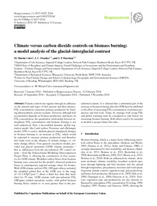 Martin Calvo, M., Prentice, I. C. and Harrison, S. P. ORCID: https://orcid.org/0000-0001-5687-1903 (2014) Climate versus carbon dioxide controls on biomass burning: a model analysis of the glacial–interglacial contrast. Biogeosciences, 11 (21). pp. 6017-6027. ISSN 1726-4170 doi: 10.5194/bg-11-6017-2014