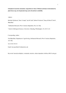 Robinson, R. J., Fraaije, B. A., Clark, I. M., Jackson, R., Hirsch, P. R. and Mauchline, T. H. (2016) Endophytic bacterial community composition in wheat (Triticum aestivum) is determined by plant tissue type, developmental stage and soil nutrient availability. Plant and Soil, 405 (1-2). pp. 381-396. ISSN 0032-079X doi: 10.1007/s11104-015-2495-4 (The final publication is available at link.springer.com)