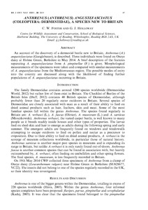 Foster, C. and Holloway, G. ORCID: https://orcid.org/0000-0003-0495-0313 (2015) Anthrenus (anthrenus) augustefasciatus (coleoptera: dermstidae), a species new to Britain. British Journal of Entomology and Natural History, 28. pp. 47-51. ISSN 0952-7583