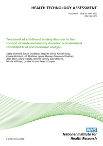 Creswell, C., Cruddace, S., Gerry, S., Gitau, R., McIntosh, E., Mollison, J., Murray, L., Shafran, R., Stein, A., Violato, M., Voysey, M., Willetts, L., Williams, N., Yu, L.-M. and Cooper, P. J. (2015) Treatment of child anxiety in the context of maternal anxiety disorder: a randomised controlled trial and economic analysis. Health Technology Assessment, 19 (38). ISSN 1366-5278 doi: 10.3310/hta19380