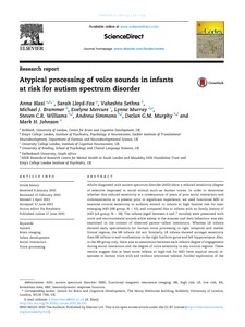 Blasi, A., Lloyd-Fox, S., Sethna, V., Brammer, M. J., Mercure, E., Murray, L., Williams, S. C.R., Simmons, A., Murphy, D. G. M. and Johnson, M. H. (2015) Atypical processing of voice sounds in infants at risk for Autism Spectrum Disorder. Cortex, 71. pp. 122-133. ISSN 0010-9452 doi: 10.1016/j.cortex.2015.06.015