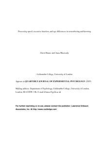 A group of young (n=52, M=23.27 years) and old (n=52, M=68.62 years) adults studied two lists of semantically unrelated nouns. For one list a time of 2 s was allowed for encoding, and for the other, 5 s. A recognition test followed where participants classified their responses according to Gardiner’s (1988) remember–know procedure. Age differences for remembering and knowing were minimal in the faster 2-s encoding condition. However, in the longer 5-s encoding condition, younger persons produced significantly more remember responses, and older adults a greater number of know responses. This dissociation suggests that in the longer encoding condition, younger adults utilized a greater level of elaborative rehearsal governed by executive processes, whereas older persons employed maintenance rehearsal involving short-term memory. Statistical control procedures, however, found that independent measures of processing speed accounted for age differences in remembering and knowing and that independent measures of executive control had little influence. The findings are discussed in the light of contrasting theoretical accounts of recollective experience in old age.
