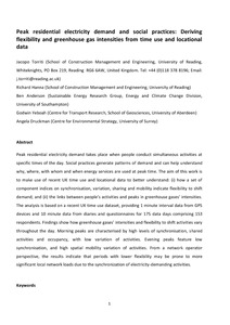 Peak residential electricity demand takes place when people conduct simultaneous activities at specific times of the day. Social practices generate patterns of demand and can help understand why, where, with whom and when energy services are used at peak time. The aim of this work is to make use of recent UK time use and locational data to better understand: (i) how a set of component indices on synchronisation, variation, sharing and mobility indicate flexibility to shift demand; and (ii) the links between people’s activities and peaks in greenhouse gases’ intensities. The analysis is based on a recent UK time use dataset, providing 1 minute interval data from GPS devices and 10 minute data from diaries and questionnaires for 175 data days comprising 153 respondents. Findings show how greenhouse gases’ intensities and flexibility to shift activities vary throughout the day. Morning peaks are characterised by high levels of synchronisation, shared activities and occupancy, with low variation of activities. Evening peaks feature low synchronisation, and high spatial mobility variation of activities. From a network operator perspective, the results indicate that periods with lower flexibility may be prone to more significant local network loads due to the synchronization of electricity-demanding activities.