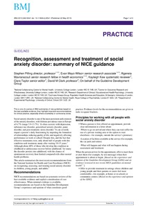 Pilling, S., Mayo-Wilson, E., Mavranezouli, I., Kew, K. M., Taylor, C., Clark, D. M., Afgan, S., Anigbogu, B., Armstrong, P., Bennett, M., Cartwright-Hatton, S., Creswell, C., Dix, M., Hanlon, N., Leggett, K., Malizia, A. L., Roberts, J., Satrettin, K., Stephens, G., Stockton, S. and Stopa, L. (2013) Recognition, assessment and treatment of social anxiety disorder: summary of NICE guidance. British Medical Journal, 346. f2541. ISSN 1468-5833 doi: 10.1136/bmj.f2541