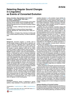 Hruschka, D. J., Branford, S., Smith, E. D., Wilkins, J., Meade, A. ORCID: https://orcid.org/0000-0001-7095-7711, Pagel, M. ORCID: https://orcid.org/0000-0001-7287-8865 and Bhattacharya, T. (2015) Detecting regular sound changes in linguistics as events of concerted evolution. Current Biology, 25 (1). pp. 1-9. ISSN 0960-9822 doi: 10.1016/j.cub.2014.10.064