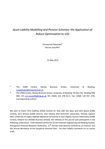 Platanakis, E. and Sutcliffe, C. ORCID: https://orcid.org/0000-0003-0187-487X (2017) Asset liability modelling and pension schemes: the application of robust optimization to USS. European Journal of Finance, 23 (4). pp. 324-352. ISSN 1466-4364 doi: 10.1080/1351847X.2015.1071714