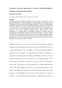 Growing criticism of Chinese engagement in Africa centres on the risk to African development posed by China's aggressive export policies and the threat to the Washington Consensus and African governance posed by China's 'non-interference' approach to engagement. This article challenges both these assumptions. The growth of Chinese trade has a wide range of impacts, depending on the sector in question, and the current terms of trade Washington extends to Africa under the auspices of the AGOA do not result in uniformly beneficial effects. With regard to African governance, it is argued that the 'Washington Consensus' has been based on competing and often muddled perceptions of US national interest. This fact tempers the regret felt at Washington's loss of influence over the good governance agenda. Evidence is provided to show that China can work within properly regulated countries and industries, if the African governments in question can provide fair, efficient and transparent environments in which to operate.