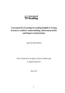 Britton, A. M. (2015) Assessment for Learning in teaching English to Young Learners: teachers’ understanding, classroom practice and impact on interactions. PhD thesis, University of Reading.