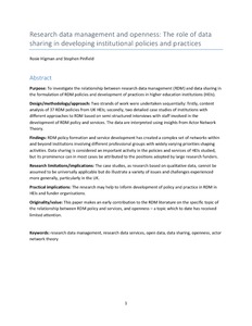 Higman, R. and Pinfield, S. (2015) Research data management and openness: the role of data sharing in developing institutional policies and practices. Program, 49 (4). pp. 364-381. ISSN 0033-0337 doi: 10.1108/PROG-01-2015-0005