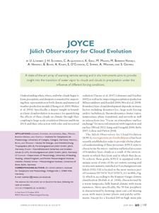 The Jülich Observatory for Cloud Evolution (JOYCE), located at Forschungszentrum Jülich in the most western part of Germany, is a recently established platform for cloud research. The main objective of JOYCE is to provide observations, which improve our understanding of the cloudy boundary layer in a midlatitude environment. Continuous and temporally highly resolved measurements that are specifically suited to characterize the diurnal cycle of water vapor, stability, and turbulence in the lower troposphere are performed with a special focus on atmosphere–surface interaction. In addition, instruments are set up to measure the micro- and macrophysical properties of clouds in detail and how they interact with different boundary layer processes and the large-scale synoptic situation. For this, JOYCE is equipped with an array of state-of-the-art active and passive remote sensing and in situ instruments, which are briefly described in this scientific overview. As an example, a 24-h time series of the evolution of a typical cumulus cloud-topped boundary layer is analyzed with respect to stability, turbulence, and cloud properties. Additionally, we present longer-term statistics, which can be used to elucidate the diurnal cycle of water vapor, drizzle formation through autoconversion, and warm versus cold rain precipitation formation. Both case studies and long-term observations are important for improving the representation of clouds in climate and numerical weather prediction models.