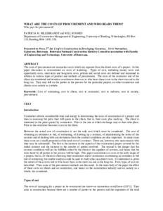 The costs of procurement are transaction costs which are separate from the direct costs of a project. In this paper discussion is concentrated on costs of tendering. Types of cost, including money costs and opportunity costs, short-term and long-term costs, private and social costs are defined and examined in relation to various types of product and methods of procurement. The costs of the contractor and of the client are considered and tentative conclusions drawn as to who bears these costs in the short-run and in the long run. They may fall on the parties to the process for the particular project, on other contractors and clients or on society as a whole.