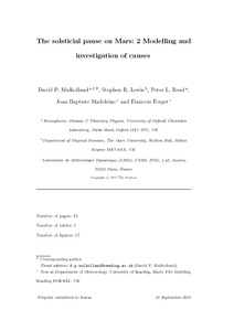 Mulholland, D. P., Lewis, S. R., Read, P. L., Madeleine, J.-B. and Forget, F. (2016) The solsticial pause on Mars: 2 modelling and investigation of causes. Icarus, 264. pp. 465-477. ISSN 0019-1035 doi: 10.1016/j.icarus.2015.08.038